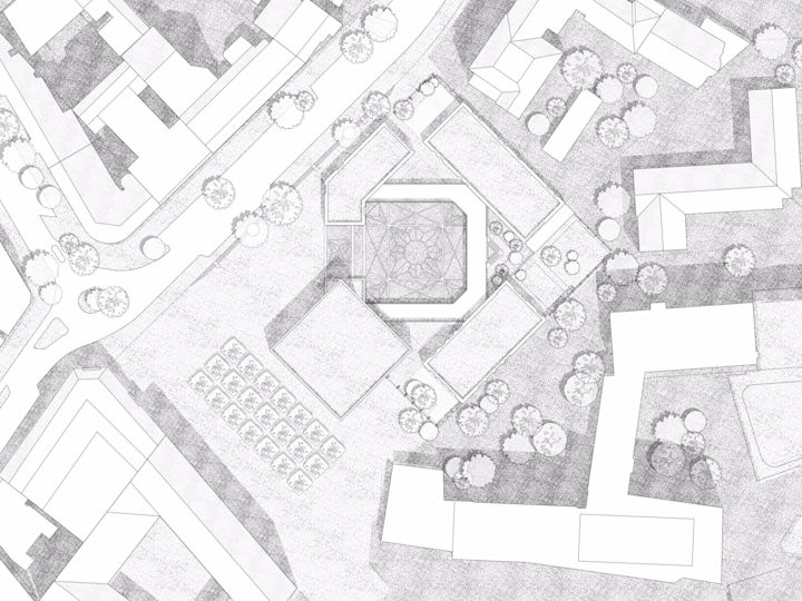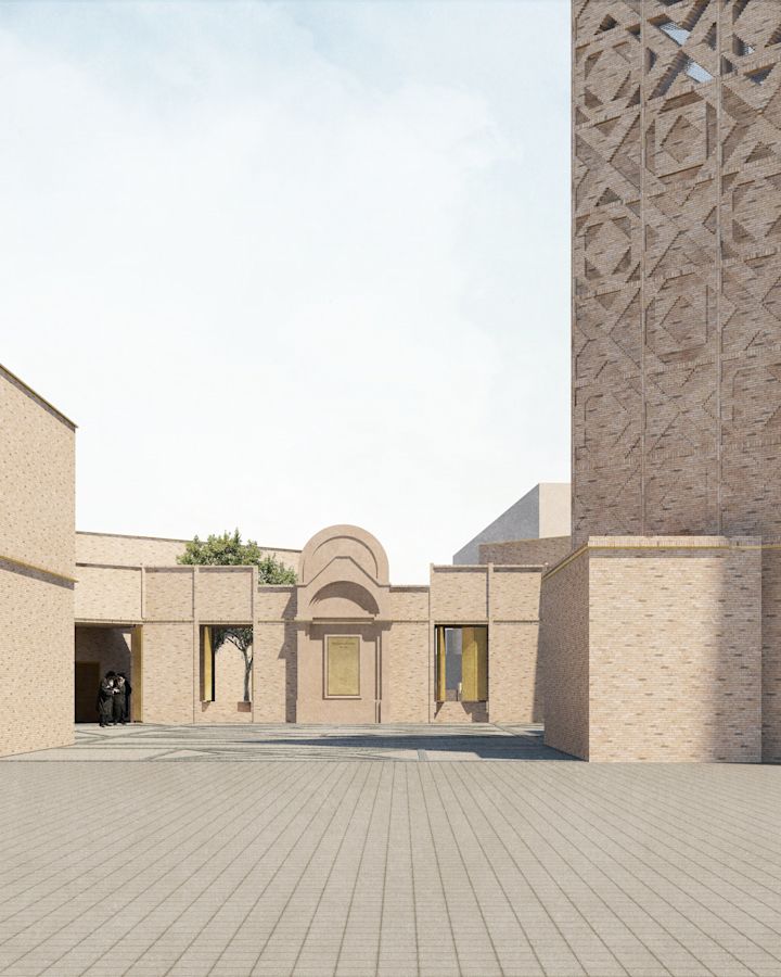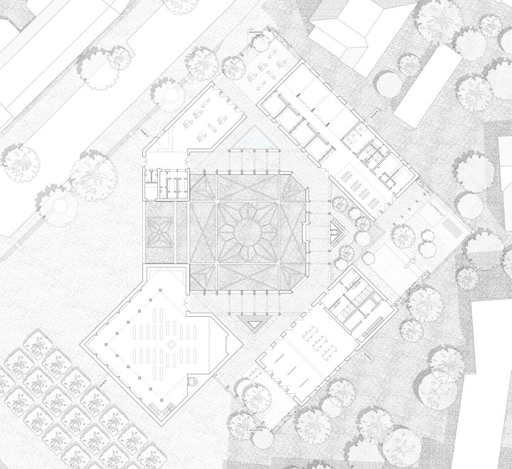 Der Entwurf interpretiert auf innovative und einzigartige Weise den Leerraum der zerstörten Bornplatz Synagoge. Inmitten der dicht bebauten Struktur wird der Platz freigehalten, um das Verlorene wieder sichtbar zu machen. Der Ort des ehemaligen Innenraums der Bornplatz Synagoge wird nicht mit Inhalt gefüllt und ist eine markante Leerstelle, die in einem Abguss des ehemaligen Thoraschreins aus pigmentiertem Beton den Höhepunkt findet. Überlagert wird der Innenraum durch das erhaltene Bodenmosaik, welches die Umrisse der einstigen Synagoge nachzeichnet. Der neue Baukörper der Synagoge wird durch eigene Ornamentik zum Stadtraum gegliedert.