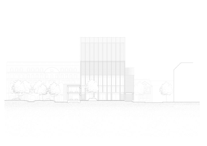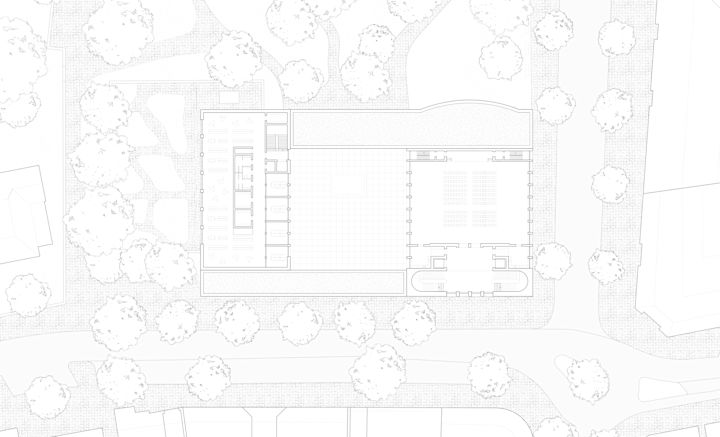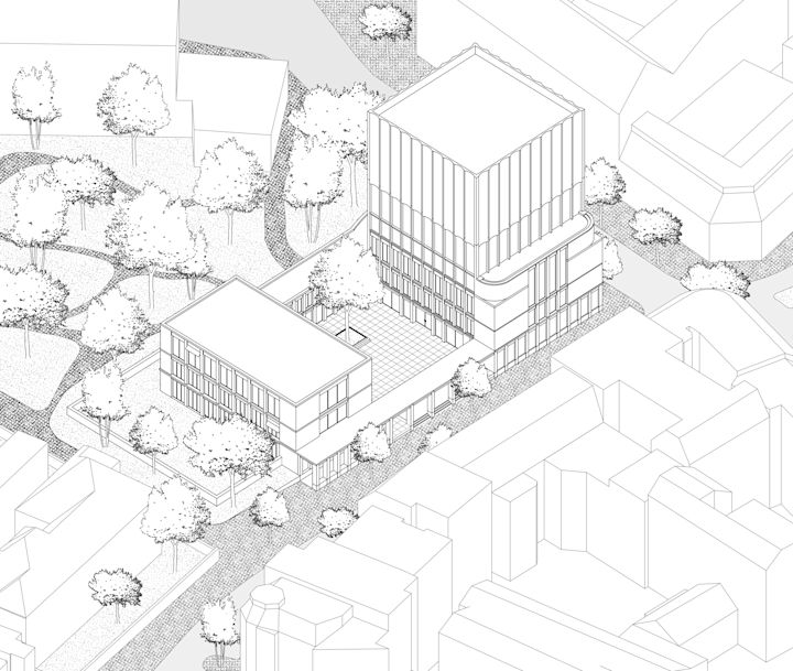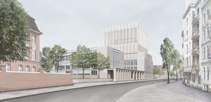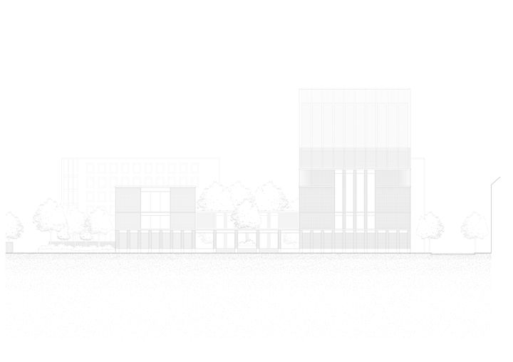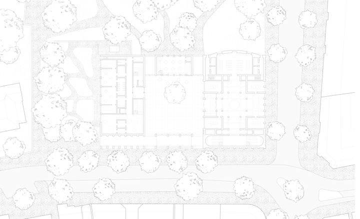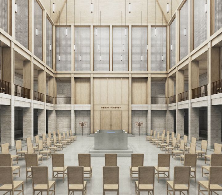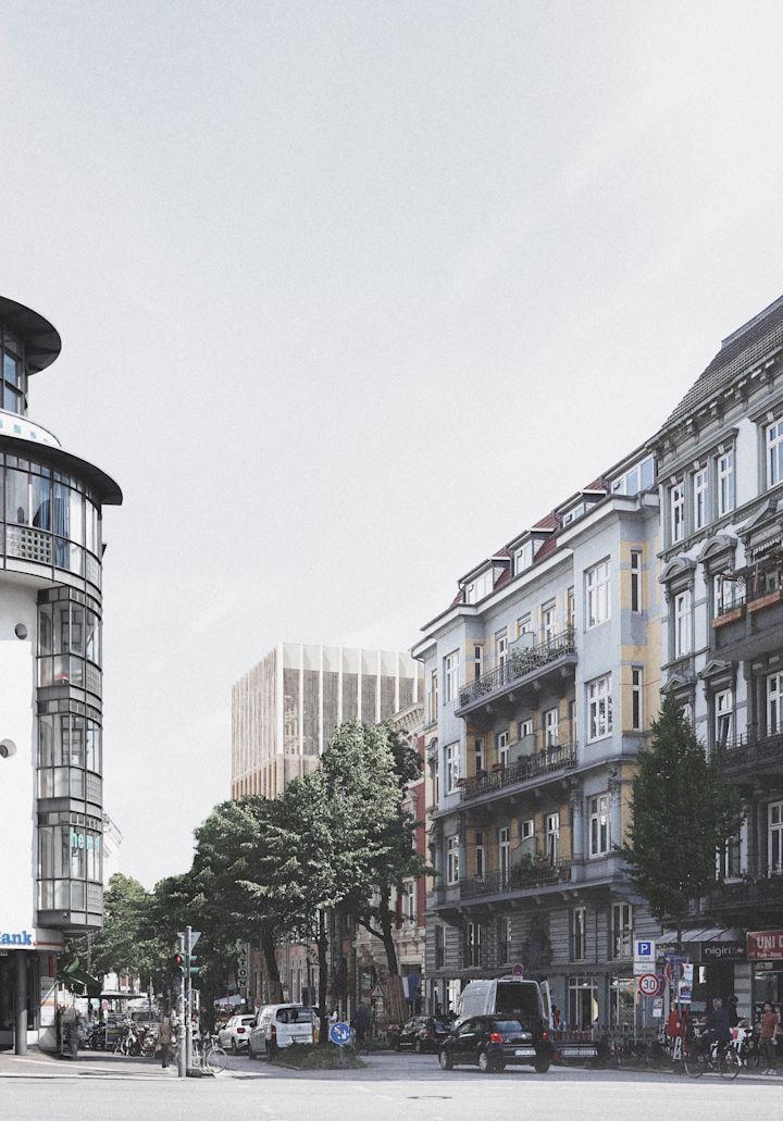 Zwei Baukörper unterschiedlicher Höhe flankieren einen halb-öffentlichen Hof. Dieser, sowie die vorgelagerten und das Gebäudepaar verbindenden Kolonnaden, schaffen als Schwellenräume vermittelnde Übergänge zwischen öffentlichem Raum und den Gebäudezugängen. Den Fluchten der bestehenden Bebauung folgend, fasst die Anlage den Straßenraum am Grindelhof und schafft eine klare Adressbildung. Das 3-geschossige Kinderhaus mit Bibliothek sucht die Nähe zur Talmud-Tora-Schule im Norden. Gemeindenutzungen wie Veranstaltungssaal und Synagogenraum werden an der westlich gelegenen Straßenkreuzung übereinander angeordnet. Mit dem Ziel an die zeichenhafte Fernwirkung der ursprünglichen Bornplatzsynagoge anzuknüpfen, entsteht mit dem Schwerpunkt des Ensembles an dieser Stelle ein aufstrebendes und selbstbewusstes Gebäude.