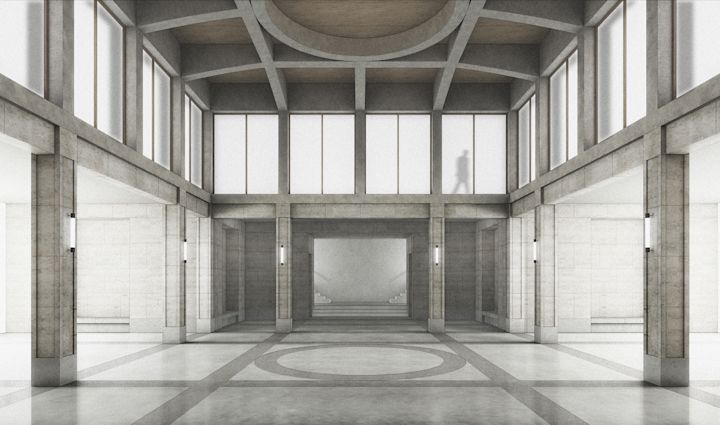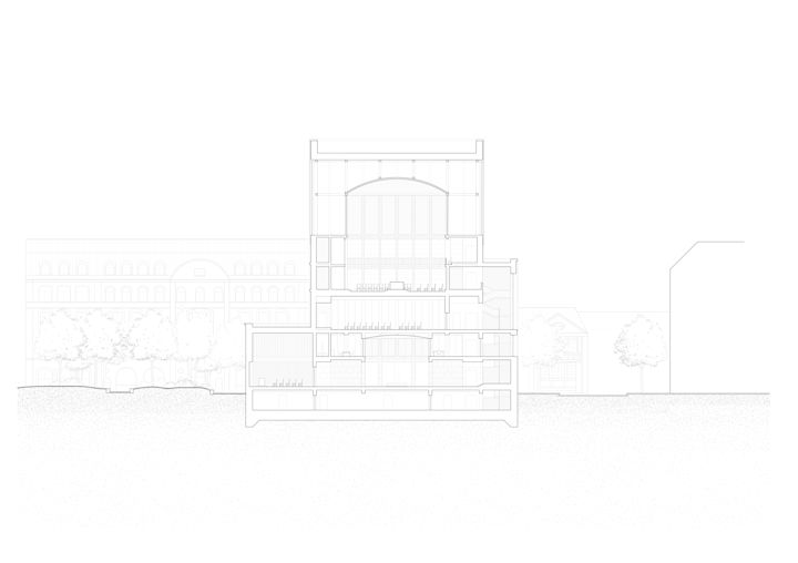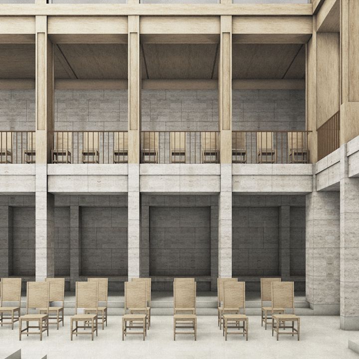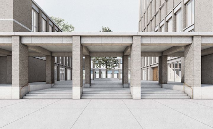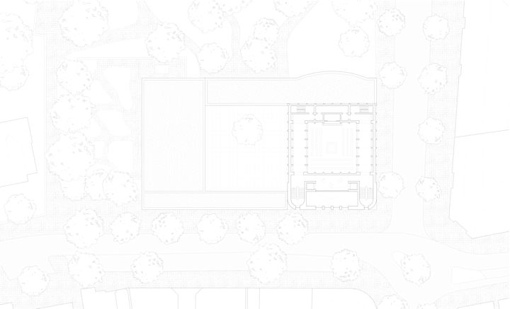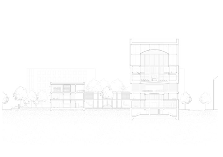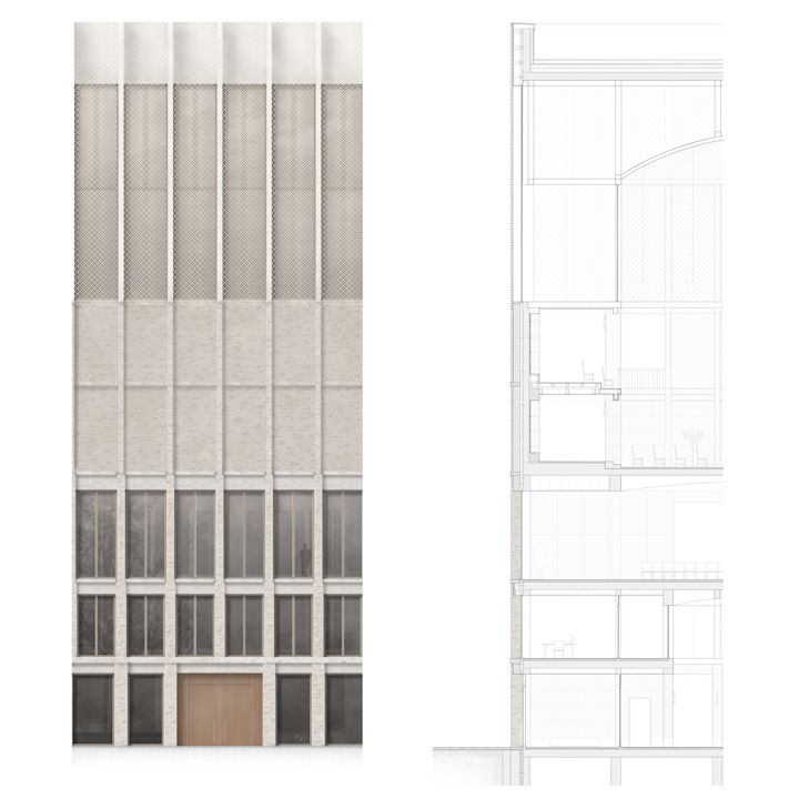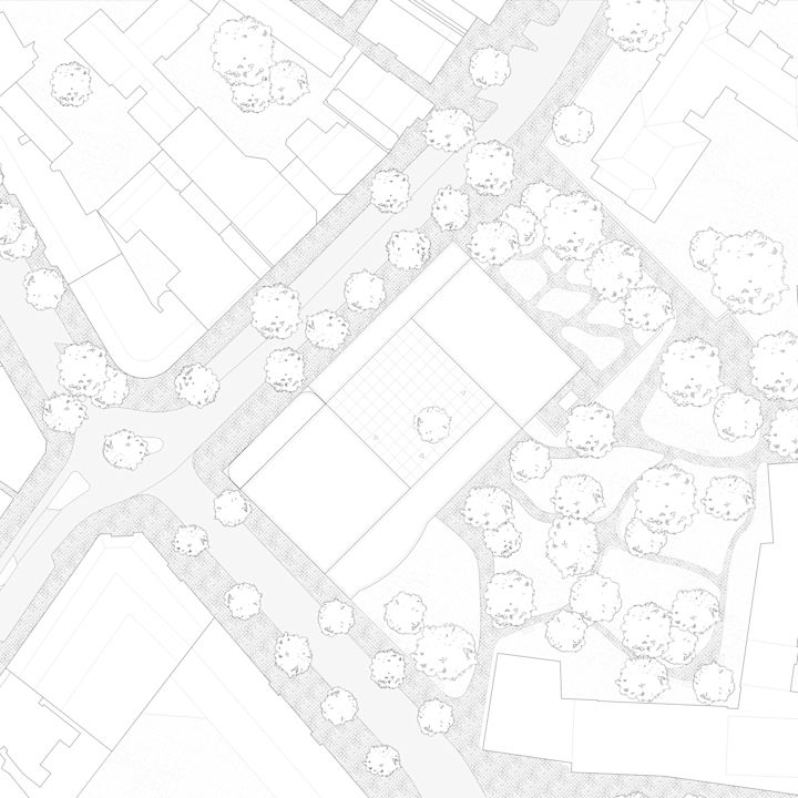 Zwei Baukörper unterschiedlicher Höhe flankieren einen halb-öffentlichen Hof. Dieser, sowie die vorgelagerten und das Gebäudepaar verbindenden Kolonnaden, schaffen als Schwellenräume vermittelnde Übergänge zwischen öffentlichem Raum und den Gebäudezugängen. Den Fluchten der bestehenden Bebauung folgend, fasst die Anlage den Straßenraum am Grindelhof und schafft eine klare Adressbildung. Das 3-geschossige Kinderhaus mit Bibliothek sucht die Nähe zur Talmud-Tora-Schule im Norden. Gemeindenutzungen wie Veranstaltungssaal und Synagogenraum werden an der westlich gelegenen Straßenkreuzung übereinander angeordnet. Mit dem Ziel an die zeichenhafte Fernwirkung der ursprünglichen Bornplatzsynagoge anzuknüpfen, entsteht mit dem Schwerpunkt des Ensembles an dieser Stelle ein aufstrebendes und selbstbewusstes Gebäude.