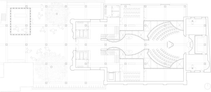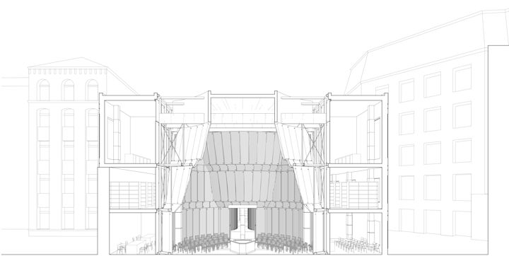Der Entwurf zieht zunächst ein Raster an Stützen ein, die sich in ihrem Rhythmus an den baulichen Überresten des Tempels orientieren, jedoch über das gesamte Grundstück und die Toreinfahrt bis zur Straße gezogen werden, und den übrigen Entwurf im Wortsinn „tragen“ – das eigentliche Gebäude scheint über sich selbst hinaus zu vibrieren. Während im Äußeren eine nüchterne Kubatur und Fassadengestalt die baulichen Überreste des zerstörten Tempels in den Vordergrund rücken, wird im Innern eine unerwartete, eigene Welt erzeugt: eine von oben belichtete Stahlkonstruktion wird allseitig mit Gussglasplatten bekleidet, und bildet den diffus leuchtenden Kern des Gebäudes, der in seinem Innern, in beinahe barockem Formwillen, den Gebetsraum trägt. Die erhaltene Apsis mit dem Toraschrein bildet hierbei das zentrale Element, an dem der Rhythmus der Stützen endet.