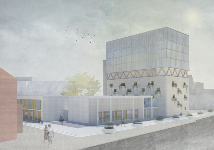 Die Verfasserin findet innerhalb der Aufgabe ihre Lösung, indem sie den bestehenden Hochbunker als massiven Sockel für eine darauf errichtete, gläserne Synagoge nutzt. Damit überschreibt sie den Hochbunker, der im Krieg anstelle der zerstörten Synagoge errichtet wurde, mit einem Fundament für den neuen Sakralraum der Synagoge. Zum einen wird das Gotteshaus und die jüdische Kultur durch das Aufsetzen und Überhöhen der Synagoge weithin sichtbar. Zum anderen erhebt sich die Synagoge über die Ebene des Profanen. Der vormalige Hochbunker der heutigen Universität nimmt einen Teil der profanen Gemeindenutzungen mit auf.