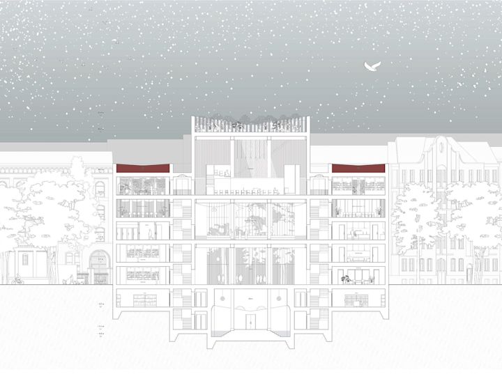 Ein kompaktes Gebäudevolumen nimmt alle öffentlichen Nutzungsbereiche der Gemeinde auf und orientiert sich mit einer selbstbewussten architektonischen Geste zum Fraenkelufer. Zwischen dem Kinderhaus an der Kohlfurter Straße und dem Gemeindezentrum spannt sich ein großzügiger grüner Innenraum auf, der von der Gemeinde unterschiedlich bespielt werden kann. Die gestapelten Programmbereiche wie Mikwen, Festsaal, Synagoge, Bibliothek unterscheiden sich durch unterschiedliche Raumcharakteristika und spezifische Atmosphären. Die lebendige Formensprache des Hauptgebäudes mit seinen Loggien, Balkonen und Dachterrassen sowie der verspielten Materialität zeugen einerseits von einem neuem Selbstbewusstsein jüdischen Lebens, zugleich treten sie in Interaktion mit der Nachbarschaft.